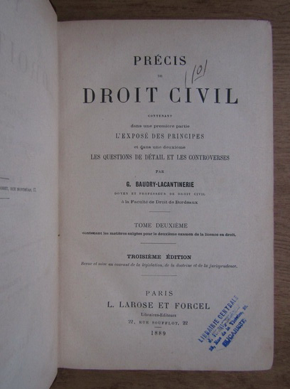 Baudry Lacantinerie - Precis de droit civil (volumul 1, 1889)