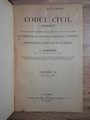 Constantin Hamangiu - Codul Civil adnotat (volumul 4, 1926)