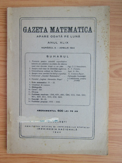 Titlu: Gazeta matematica, anul XLIX, nr. 8, aprilie 1944