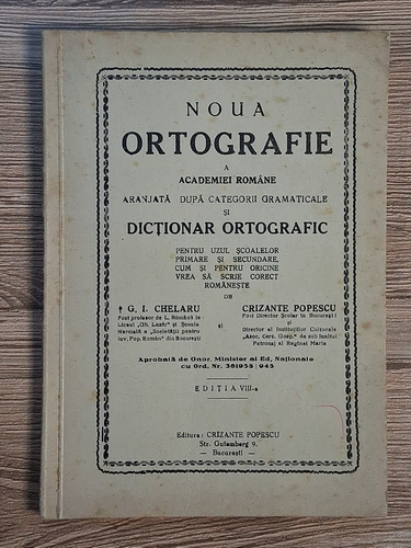 G. I. Chelaru, Crizante Popescu - Noua ortografie a Academiei Romane, aranjata dupa categorii gramaticale, si dictionar ortografic (1945)