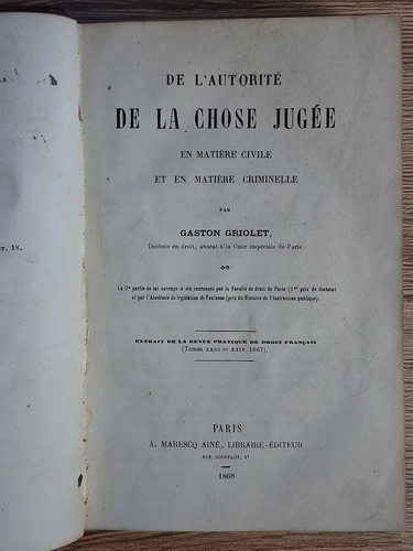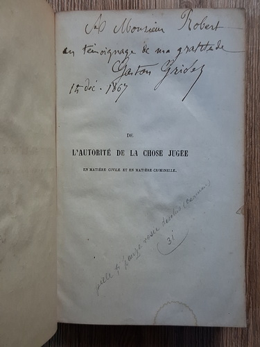 Gaston Griolet - De l'autorite de la chose jugee. En matiere civile et en matiere criminelle (cu autograful autorului, 1868)