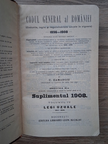 Constantin Hamangiu - Codul general al Romaniei. Legi uzuale (volumul 4, suplimentul 1908)