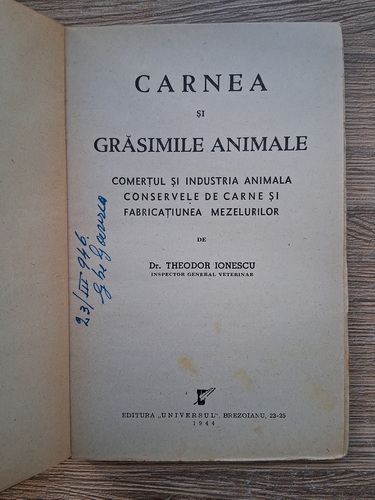 Theodor Ionescu - Carnea si grasimile animale. Comertul si industria animala. Conservele de carne si fabricatiunea mezelurilor (1944)