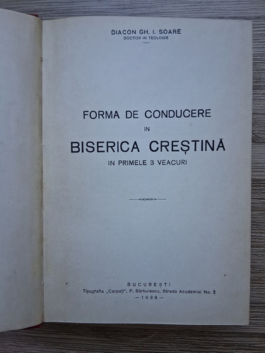 Gh. I. Soare - Forma de conducere in Biserica Crestina in primele 3 veacuri (1938)
