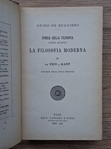 Guido de Ruggiero - Storia della filosofia, partea a IV-a. La filosofia moderna, volumul 3. Da Vico a Kant (1941)