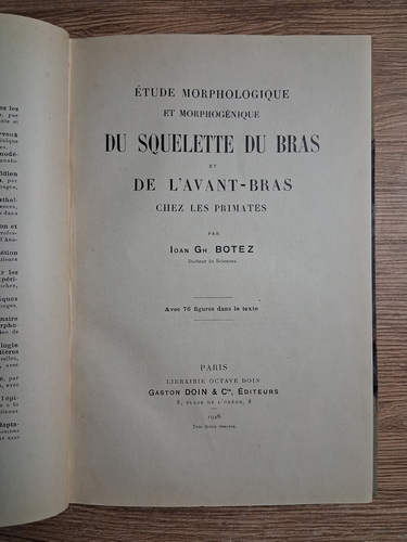 Ioan Gh. Botez - Etude morphologique et morphogenique. Du squelette du bras et de l'avant-bras chez les primates (1926)