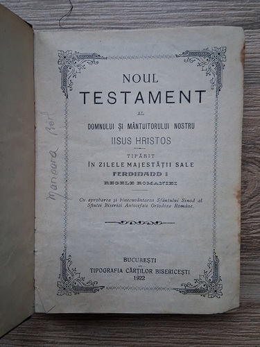 Titlu: Noul Testament al Domnului si Mantuitorului nostru IIsus Hristos, tiparit in zilele Majestatii sale Ferdinand I (1922)