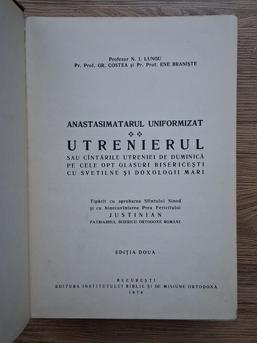 N. I. Lungu, Gr. Costea, Ene Braniste - Anastasimatarul uniformizat. Utrenierul sau cantarile treniei de duminica pe cele opt glasuri bisericesti cu svetilne si doxologii mari