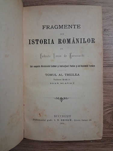 Eudoxiu Baron de Hurmuzaki - Fragmente din Istoria Romanilor. Traducere facuta de Ioan Slavici (volumul 3, 1900)
