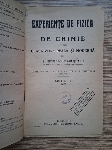 Titlu: Experiente de fizica si de chimie pentru clasa a VIII-a reala si moderna (1925)