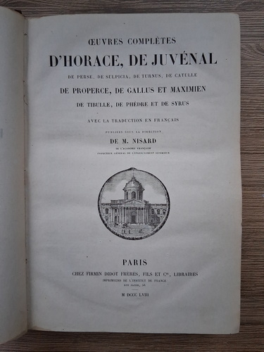 Titlu: Oeuvres completes de D'Horace, de Juvenal, de Perse, de Suplicia, de Turnus, de Catulle, de Properce, de Gallus et Maximien, de Tribulle, de Phedre et de Syrus (1858)