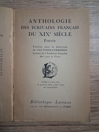 Titlu: Anthologie des ecrivains francais du XIXe siecle. Poesie (volumul 1, 1931)