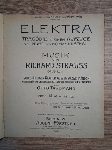 Titlu: Elektra. Tragodie in einem aufzuge von Hugo von Hpfmannsthal. Musik von Richard Strauss (opus LVIII, partituri, 1909)