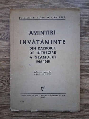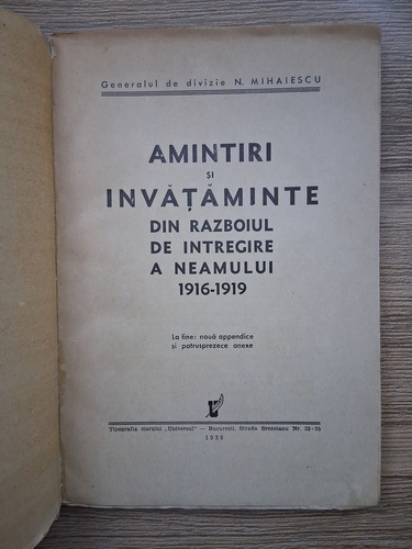 Titlu: Amintiri si invataminte din razboiul de intregire a neamului 1916-1919 (1936)