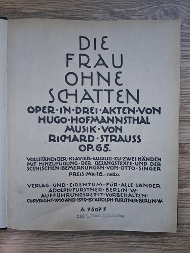 Titlu: Die Frau ohne Scatten. Oper in drei akten von Hugo, Hofmannsthal. Musik von Richard Strauss, op. 65. Klavier-Auszug zu zwei handen (1916-1919, partituri)