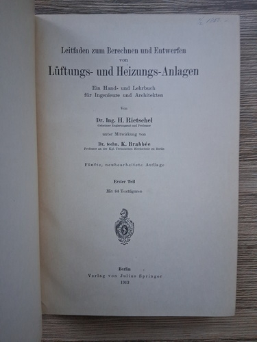 H. Rietschel - Leitfaden zum Berechnen und Entwerfen von Luftungs-und Heizungs-Anlagen (2 volume, 1913)