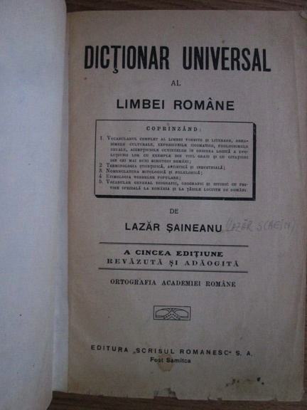 Lazar Saineanu - Dictionar universal al limbei romane (a cincea editiune, 1925)